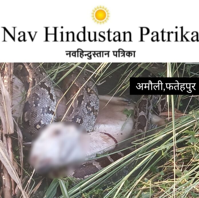 अमौली,फतेहपुर।चाँदपुर थाना क्षेत्र के मदरी गांव में तालाब के किनारे चर रही बकरी को अजगर ने पकड़ा, जानकारी के अनुसार बता दे की गांव के ही निवासी सुमित पुत्र शिव प्रसाद गांव के बाहर तालाब के किनारे बकरी चरा रहा था तभी तालाब के नजदीक अजगर साँप ने बकरी को अपना शिकार बना लिया।चर रही बकरी को जैसे ही अजगर ने पकड़ा तो जानवर चरा रहे सुमित ने अजगर को देख कर जोर जोर से चिल्लाने लगा उपस्थित स्थानीय लोगों सहित मौके में सैकड़ो लोगो की भीड़ इक्कठा हो गयी जानोजौहत करने के बाद स्थानीय लोगों की मदद से अजगर से बकरी को छुड़ा लिया गया लेकिन तब तक बकरी की मौत हो चुकी थी।गांव में अजगर निकने से दहशत का माहौल बना हुआ है।