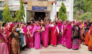 जहानाबाद थाने का घेराव कर प्रदर्शन करतीं गुलाबी गैंग लोकतांत्रिक की महिलाएं।
