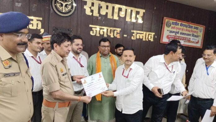 उन्नाव।आज जिलाधिकारी श्री गौरांग राठी जी की अध्यक्षता में पुलिस अधीक्षक श्री जय प्रकाश जी की उपस्थिति में जनपद की तहसील बांगर मऊ में सम्पूर्ण समाधान दिवस का आयोजन किया गया। इस अवसर पर जिलाधिकारी ने तहसील दिवस में आने वाली फरियादियों की शिकायतों को एक-एक करके गंभीरता से सुना और गुणवत्तापूर्ण निस्तारण के निर्देश संबंधित अधिकारी को दिए । इस अवसर पर जिलाधिकारी व माननीय विधायक बांगर मऊ श्री कांत कटियार जी ने तालाब आवंटन स्वामित्व योजना, घरौनी और विरासत के लाभार्थियों को प्रमाण पत्र और फलों से भरी हुई टोकरी देकर सम्मानित किया गया। साथ ही राजस्व सम्बन्धी उत्कृष्ट कार्य करने वाले लेखपालों को प्रशस्ति पत्र देकर सम्मानित किया गया । इसी प्रकार तहसील परिसर में जनसंपर्क कार्यालय का फीता काटकर उद्घाटन किया गया। उपजिलाधिकारी बांगर मऊ ने जनसंपर्क कार्यालय के बारे में जिलाधिकारी को जानकारी देते हुए बताया कि लेखपाल राजस्व निरीक्षक की एक टीम बैठेगी और शिकायतकर्ता से बातचीत कर उसके प्रार्थना पत्र को लेकर निस्तारण कराएगी । इस कक्ष में आय जाति निवास विरासत आदि के बोर्ड लगाए गए हैं जिसमें सभी महत्वपूर्ण जानकारी लिखी गई है शिकायतकर्ता की पहुंचने पर पूरी जानकारी टीम द्वारा दी जाएगी। जिलाधिकारी ने संपूर्ण कक्ष का अवलोकन कर आवश्यक बिंदुओं पर जानकारी ली।