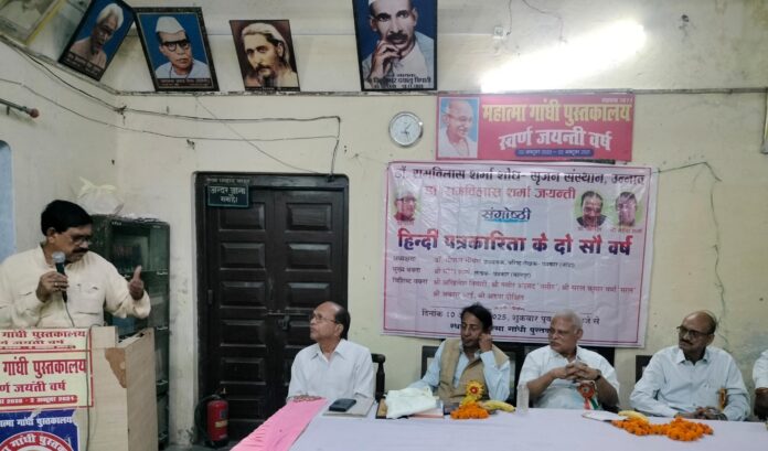 उन्नाव।देश के प्रतिष्ठित साहित्यकार, भाषाविद तथा हिंदी के सुप्रसिद्ध आलोचक डॉ रामविलास शर्मा की जयंती के अवसर पर एक संगोष्ठी “हिंदी पत्रकारिता के 200 वर्ष” का आयोजन स्थानीय महात्मा गांधी पुस्तकालय में किया गया । जिसमें उपस्थित वक्ताओं ने हिंदी के प्रथम अखबार उद्दंड मार्तण्ड से प्रारंभ हुई पत्रकारिता से आज तक की पत्रकारिता के सफर पर प्रकाश डाला । कार्यक्रम का आयोजन डॉ रामविलास शर्मा शोध सृजन संस्थान द्वारा किया गया । कार्यक्रम की अध्यक्षता सूचना निदेशालय से सेवानिवृत्त हेमंत नंदन पंत ने की तथा कार्यक्रम का संचालन डॉ रामनरेश द्वारा किया गया । इस अवसर पर “डॉ रामविलास शर्मा पत्रकारिता सृजन सम्मान” से वरिष्ठ पत्रकार महेश शर्मा जी को सम्मानित किया गया ।