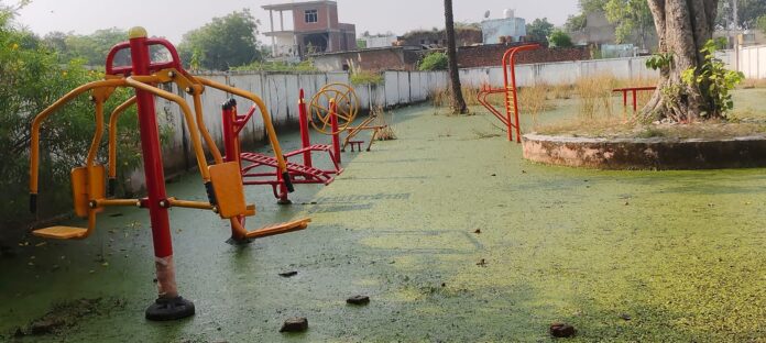 मंदिर परिसर मे जलभराव के कारण विधायक निधि से लगवाए गए उपकरण हो रहे बर्बाद
