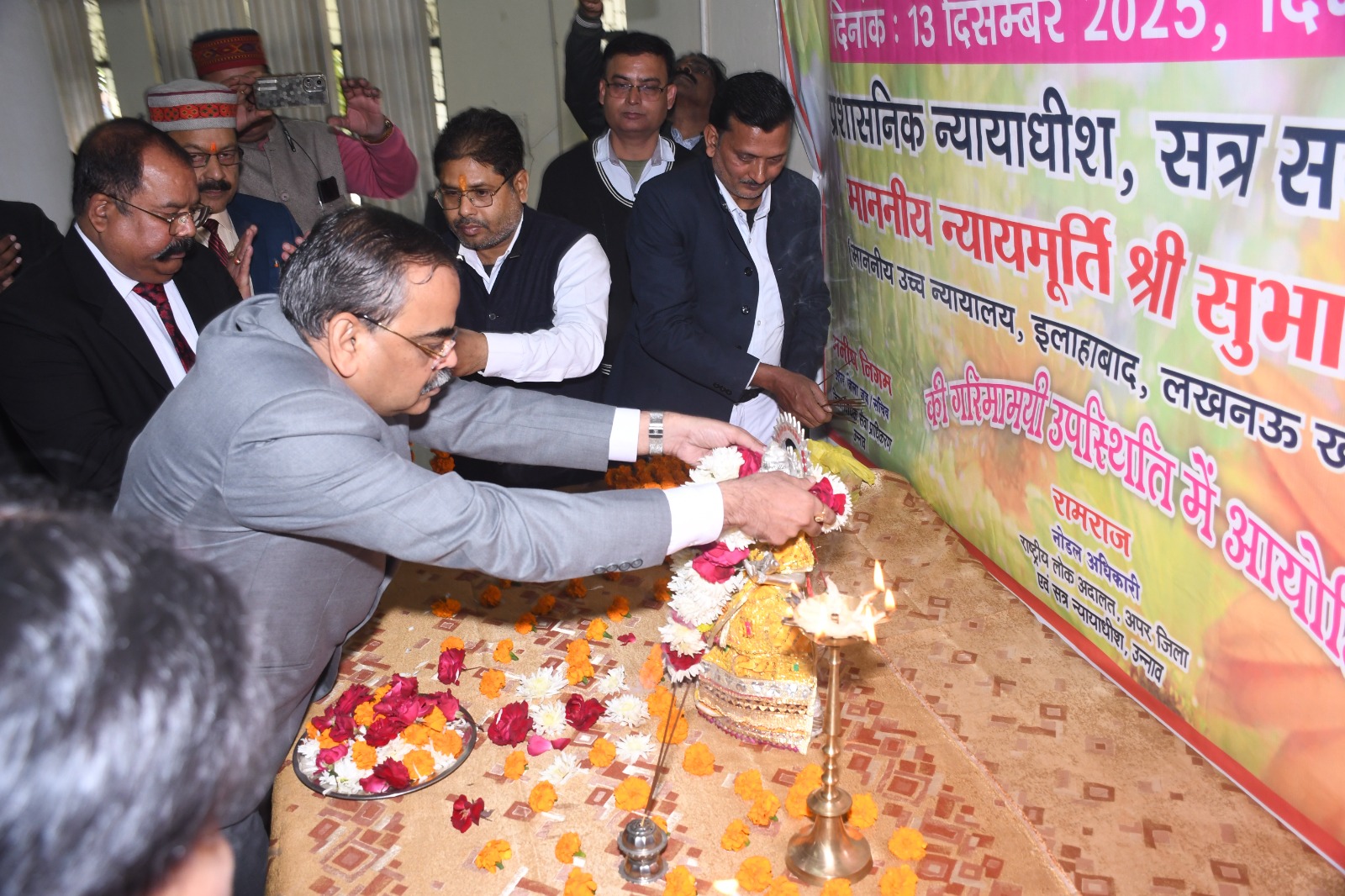 उन्नाव।माननीय प्रशासनिक न्यायामूर्ति, उन्नाव श्री सुभाष विद्यार्थी महोदय की गरिमामयी उपस्थिति में जनपद न्यायालय, उन्नाव के केन्द्रीय सभागार में दीप प्रज्जवलन एवं माँ सरस्वती की प्रतिमा में माल्यार्पण करके राष्ट्रीय लोक अदालत-13.12.2025 का शुभारम्भ किया गया | इसके पश्चात जनपद न्यायाधीश उन्नाव, श्री अनिल कुमार वर्मा-I महोदय द्वारा माननीय प्रशासनिक न्यायामूर्ति श्री सुभाष विद्यार्थी महोदय को गुलदस्ता एवं लाइव प्लांट भेंट किया गया| इसी क्रम में श्री सुनील कुमार वर्मा-I न्यायाधीश परिवार न्यायालय द्वारा भी गुलदस्ता एवं लाइव प्लांट भेंट किया गया तथा श्री नित्यानंद श्रीनेत्र, पीठासीन अधिकारी मोटर दुर्घटना दावा अधिकरण, श्री रामायण शर्मा पीठासीन अधिकारी स्थाई लोक अदालत, श्रीमती कविता मिश्रा अपर जिला जज, श्रीमती ममता सिंह अपर जिला जज, श्री रामराज-II, अपर जिला जज/नोडल अधिकारी राष्ट्रीय लोक अदालत, श्रीमती शिप्रा आर्या, श्रीमती पूनम-II अपर न्यायाधीश परिवार न्यायालय द्वितीय, श्री जयवीर सिंह नागर अपर जिला जज, श्री विवेकानन्द विश्वकर्मा अपर जिला जज, श्री शैलेन्द्र सिंह यादव अपर जिला जज, श्री महेंद्र कुमार सिंह अपर जिला जज, श्री विमल त्रिपाठी अपर जिला जज, श्री स्वतंत्र प्रकाश अपर जिला जज, श्री रवि प्रकाश साहू अपर जिला जज,श्रीमती भव्या तिवारी मुख्य न्यायिक मजिस्ट्रेट, बार एसोसिएशन उन्नाव के अध्यक्ष श्री गिरीश कुमार मिश्रा, बार एसोसिएशन उन्नाव, महामंत्री अनुराग कुमार बाजपेयी, श्री सुशील कुमार गोंड अपर जिलाधिकारी (वित्त एवं राजस्व), श्री जय प्रकाश सिंह पुलिस अधीक्षक एवं बैंकों के पदाधिकारियों द्वारा भी माननीय प्रशासनिक न्यायामूर्ति महोदय गुलदस्ता भेंट किया गया | श्री मनीष निगम अपर जिला जज/सचिव, जिला विधिक सेवा प्राधिकरण, उन्नाव द्वारा उक्त कार्यक्रम का सफल संचालन किया गया|