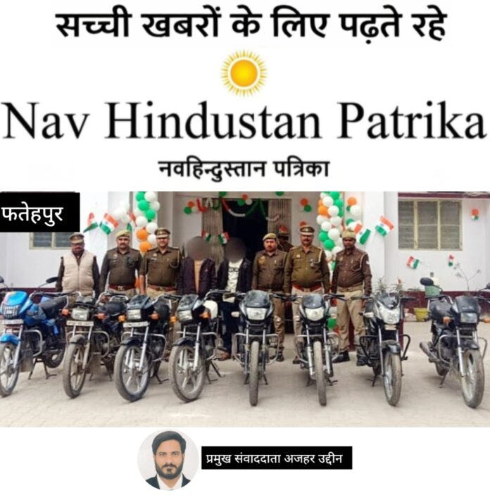 की सूचना पर अभियुक्त मनदीप कुमार उर्फ गोलू रैदास पुत्र बचानी लाल निवासी हरीरामपुर कैथौला थाना हथगांव व शिवम विश्वकर्मा पुत्र राकेश विश्वकर्मा निवासी आलीमऊ थाना हथगांव को गिरफ्तार किया गया। उनके कब्जे से चोरी की आठ मोटर साइकिल बरामद की गईं। गिरफ्तार एवं बरामदगी के आधार पर थाना कोतवाली पर मु0अ0सं0 34/2026 धारा 303(2), 317(2), 318, 336, 340(2) बीएनएस पंजीकृत कर गिरफ्तार अभियुक्तों को न्यायालय भेजा गया। गिरफ्तारी करने वाली टीम में प्रभारी निरीक्षक के अलावा उपनिरीक्षक राजेन्द्र प्रसाद यादव, वंशीदर राय, राजकुमार, हेड कांस्टेबल सुनील कुमार, कांस्टेबल श्याम सिंह, चन्दन यादव शामिल रहे।